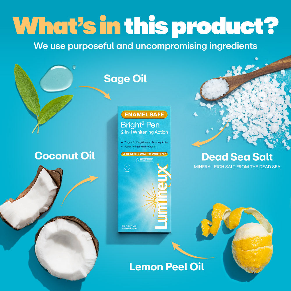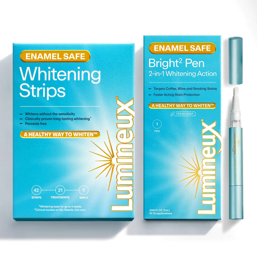 This bundle pairs Lumineux's best-selling Enamel-Safe Whitening Strips with the 2-in-1 Whitening Pen for a complete, enamel-first whitening routine. The strips gently lift surface stains to visibly whiten teeth, while the 2-in-1 Whitening Pen helps prevent new stains before they set and maintains brightness between treatments. Together, they deliver effective whitening without penetrating or weakening enamel, so you can brighten your smile and keep it white over time, without sensitivity.