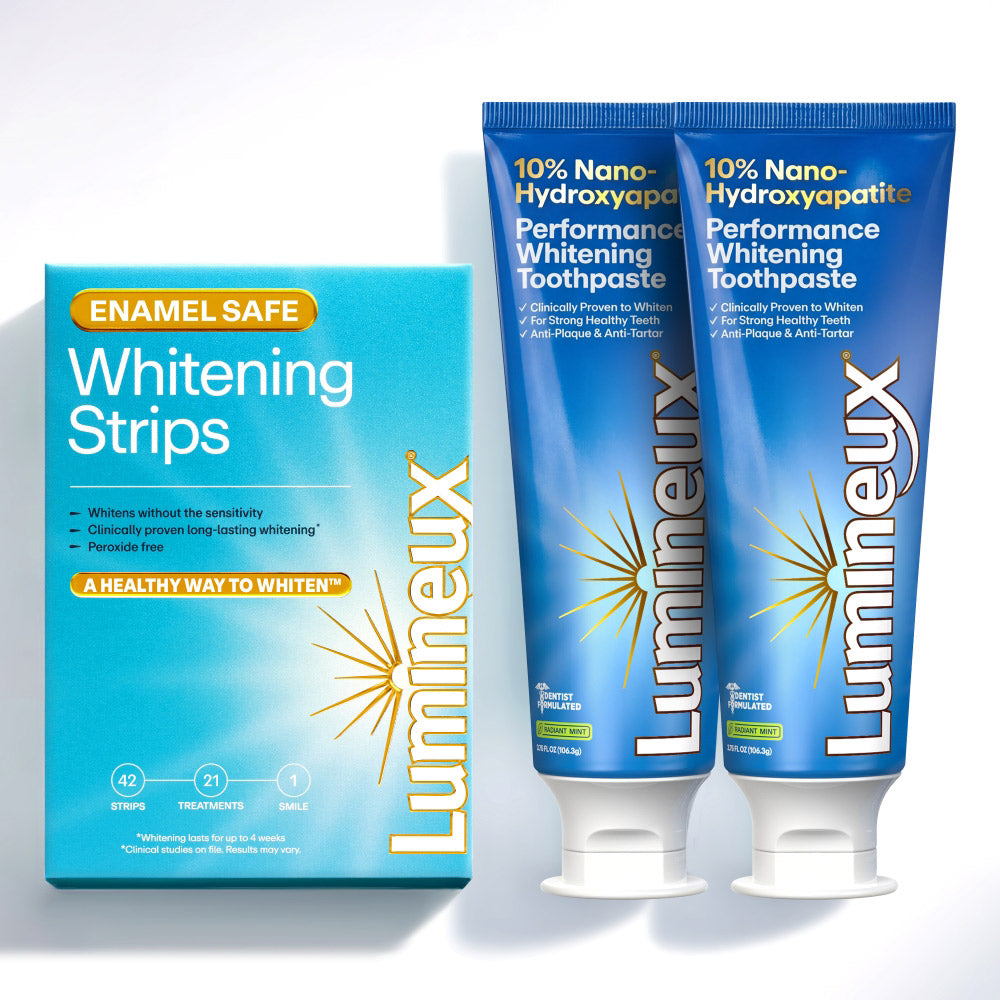 The Lumineux Duo Set Kit pairs our best-selling, enamel-safe Whitening Strips with our NEW 10% Nano Hydroxyapatite Toothpaste for enamel-conscious whitening and a brighter, healthier-looking smile. Lumineux 10% Nano Hydroxyapatite Toothpaste supports enamel health using nano-hydroxyapatite, a NASA-developed technology made from the natural building blocks of tooth enamel, helping clean and polish the tooth surface while supporting enamel integrity without harsh abrasives or aggressive ingredients, making it ideal for everyday use. Paired with Lumineux Enamel-Safe Whitening Strips, which gently lift surface stains using mineral-rich sea salt and oil-based actives instead of peroxide, this bundle delivers visible whitening that’s easy on enamel and suitable for all teeth types, including sensitive teeth.