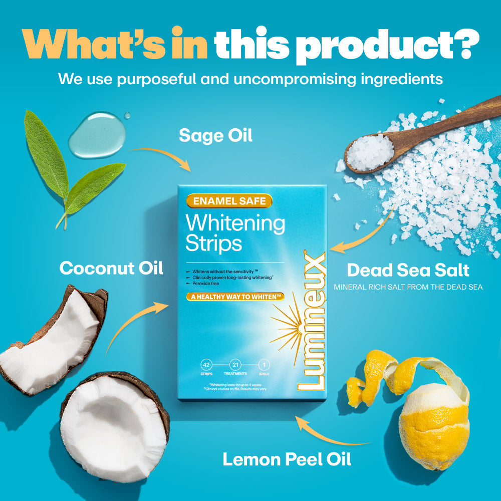 - Whitening Strips (21 Treatments) Vegetable Glycerol, Deionized Water, Carbomer, Carboxymethyl, Cocos Nucifera (Coconut) Oil, Dead Sea Salt (Maris Sal), Salvia Officinalis (Sage) Oil, Citrus Limon (Lemon) Peel Oil